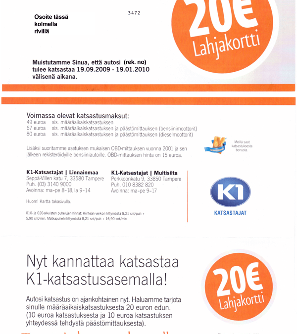 Aikaisemmin posti on pudotellut vain A-katsastuksen ja K1 Katsastajien lippusia, joissa pointtina on ollut vain se, että autosi pitäisi katsastaa tällöin viiva tuolloin. Me ollaan täällä.