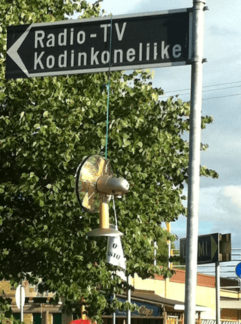 No, minkälaisen markkinointikampanjan oli tehnyt Westerlund. Liikenneympyrän välittömässä läheisyydessä on tienvarsikyltti, joka ohjaa liikkeen pihaan. Tähän kylttiin kodinkoneliike oli ripustanut kultaiseksi maalatun pöytätuulettimen ja lapun, jossa ilmeisesti luki: ”Meillä tuulettimia”. Lappu oli kääntynyt, mutta asia tuli taatusti selväksi.