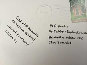 Käsinkirjoitettuna vastaanottajan tiedot (aivan kuten olemme saarnanneet) ja lyhyt tervehdysviesti.