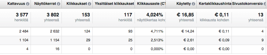 Mutta kun vilkaiset Sivustokonversio-saraketta, huomaatkin, että tämä mainos on toiminut tavoitteen kannalta itse asiassa paljon paremmin. Jälkimmäisessä mainoksessa yhden konversion hinnaksi tulee 0,29 €, ylemmässä 3,56 €. Nämä lukemat suhteutetaan tietenkin katteeseen ja asiakkuuden kokonaisarvoon.