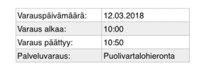 No aloitetaanpa vaikka siitä verkkoilmoittautumisesta. Jokaisesta hierojasta pitäisi olla lyhyt esittely, jossa avataan hänen spesialiteettejaan. Varauksen jälkeen sain tällaisen viestin sähköpostiini: