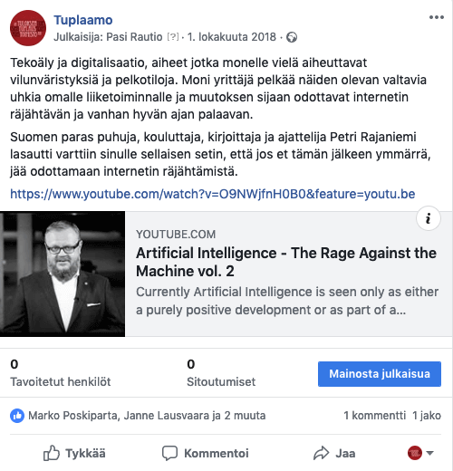 Jos haluat oppia lisää Facebook-mainonnasta, tule mukaan Tuplaamon Facebook-mainontapäivään! Käytännönläheinen koulutus pidetään 21.3.2019. Päivän aikana käymme yksityiskohtaisesti läpi, mitä toimenpiteitä tarvitset alkuun pääsemiseen, miten tehostat jo olemassa olevaa mainontaasi sekä miten Facebook-mainonta yhdistyy tehokkaaksi osaksi muuta markkinointiasi.