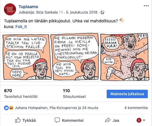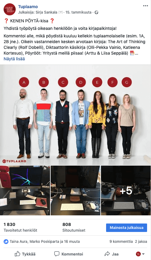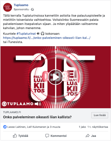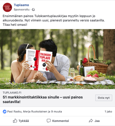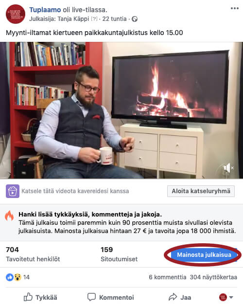 Julkaisun sponsorointi perustuu helppouteen ja nopeuteen; mainosten hallinnan kautta luotavan monivaiheisen mainoksen sijaan pääset luomaan sen suoraan Facebook-sivusi kautta, painamalla julkaisun alareunassa näkyvää mainosta julkaisua -painiketta. Luonti onnistuu kyllä myös mainosten hallinnan kautta, mutta tähän en sinua kannusta (varsinkaan, jos olet aloitteleva mainostaja). Sponsoroidut julkaisut kun toimivat parhaiten nopeana ja helppona ratkaisuna, etsiessäsi tehokkaalle julkaisulle laajempaa yleisöä.