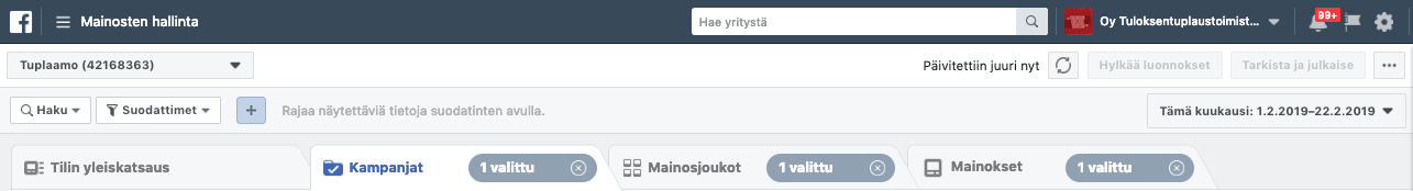 Mainosten hallinta on erillinen työkalu mainosten rakentamiseen. Sen kautta löydät myös tarkempia lukuja mainosten sekä sponsoroitujen julkaisujen tuloksista. Mainosten hallintaan pääset kirjautumaan suoraan täällä.