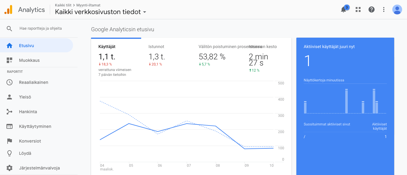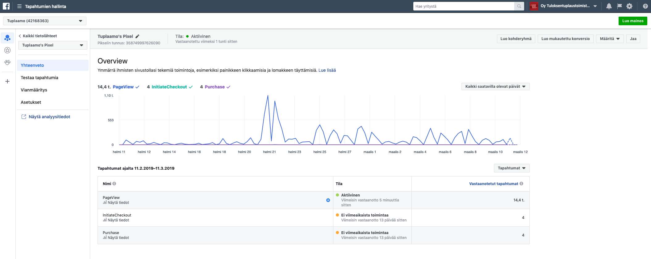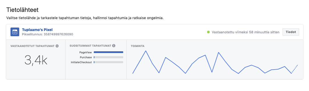 Pikselit-osiosta voit myös tarkastella tiettyjen sivujen keräämää liikennettä erillisten urlien eli nettisivuosoitteiden avulla (esimerkiksi tämä on url: https://tuplaamo.fi). Näin ollen näet pikselin kautta koko sivustosi liikenteen, tai voit halutessasi tarkastella erikseen tietyn alasivun liikennettä. Pikseli kun tallentaa automaattisesti kaiken liikenteen seurannan alaisilta nettisivuilta.
