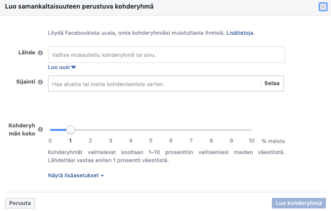 Pikselin avulla voit myös rakentaa look-a-like- eli kaksoisolentokohderyhmiä. Nämä ovat ihmisryhmiä, jotka muistuttavat ominaisuuksiltaan nettisivusi kävijöitä tai jonkin tavoitteesi toteuttaneita ihmisiä (kuten verkkokaupastasi jo ostaneita). Eli toisin sanoen Facebook kategorioi pikselin tunnistamia ihmisiä, heitä yhdistäviä ominaisuuksia ja kiinnostuksen kohteita ja laatii nämä kriteerit täyttävistä ihmisistä täysin uuden kohderyhmän.
